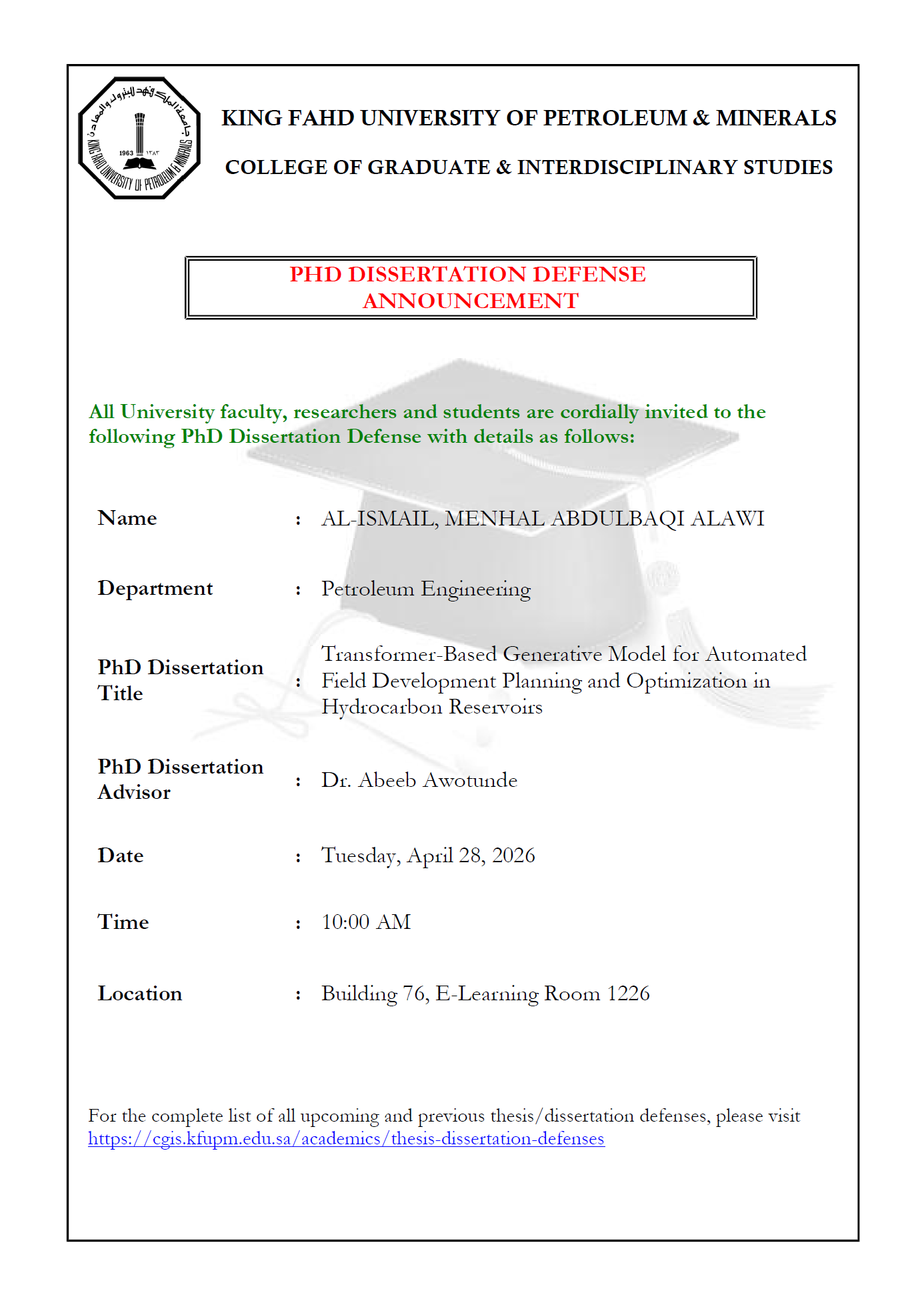 28apr10:00 am- 11:00 amPHD DISSERTATION DEFENSE ANNOUNCEMENTAL-ISMAIL, MENHAL ABDULBAQI ALAWI - Transformer-Based Generative Model for Automated Field Development Planning and Optimization in Hydrocarbon Reservoirs10:00 am - 11:00 am Building 76, Room #1226, King Fahd University of Petroleum & Minerals,