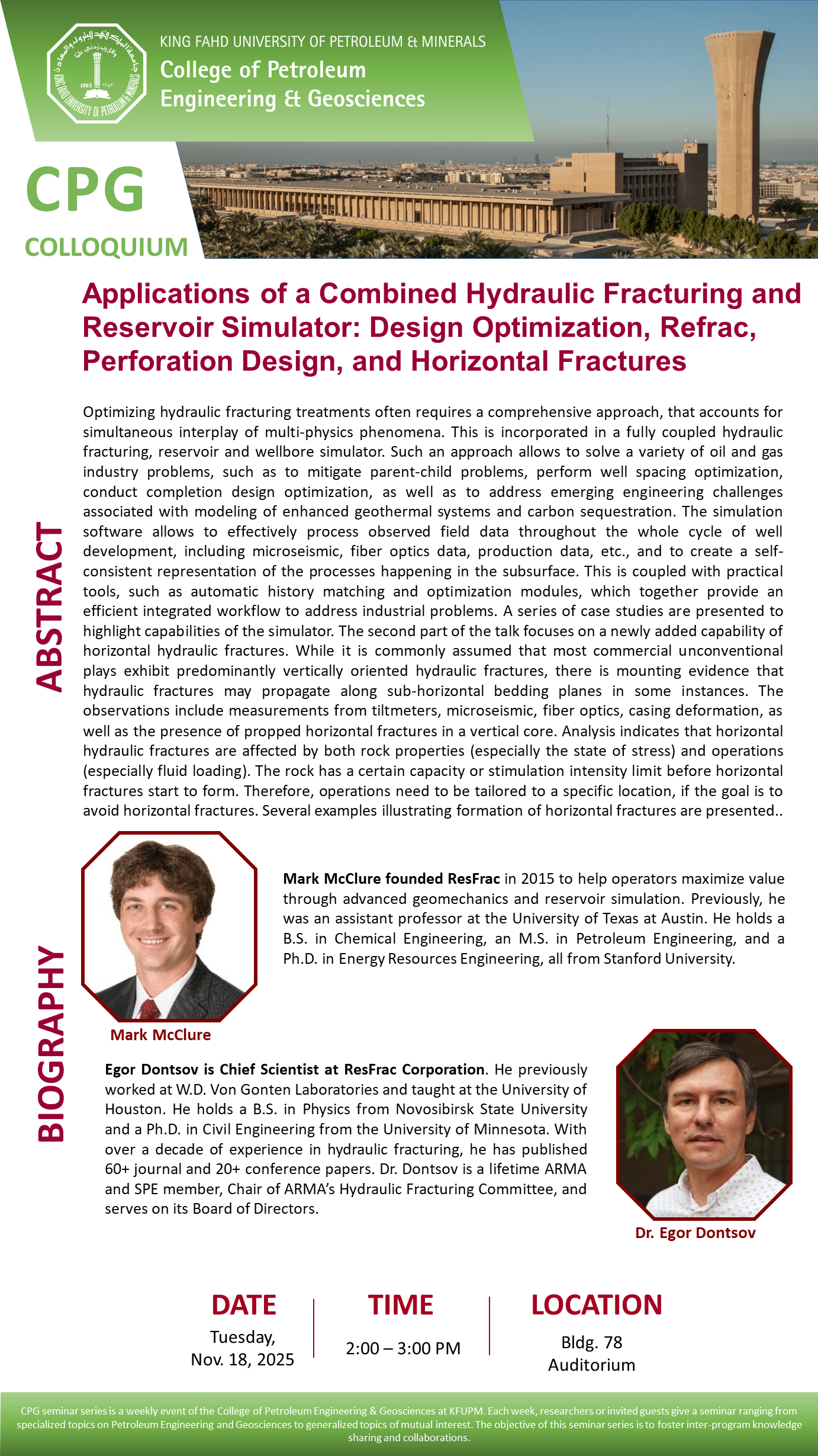 18nov2:00 pm- 3:00 pmCPG COLLOQUIUMApplications of a Combined Hydraulic Fracturing and Reservoir Simulator: Design Optimization, Refrac, Perforation Design, and Horizontal Fractures - Dr. EgorDontsoy & Mark McClure2:00 pm - 3:00 pm Building 78, Auditorium