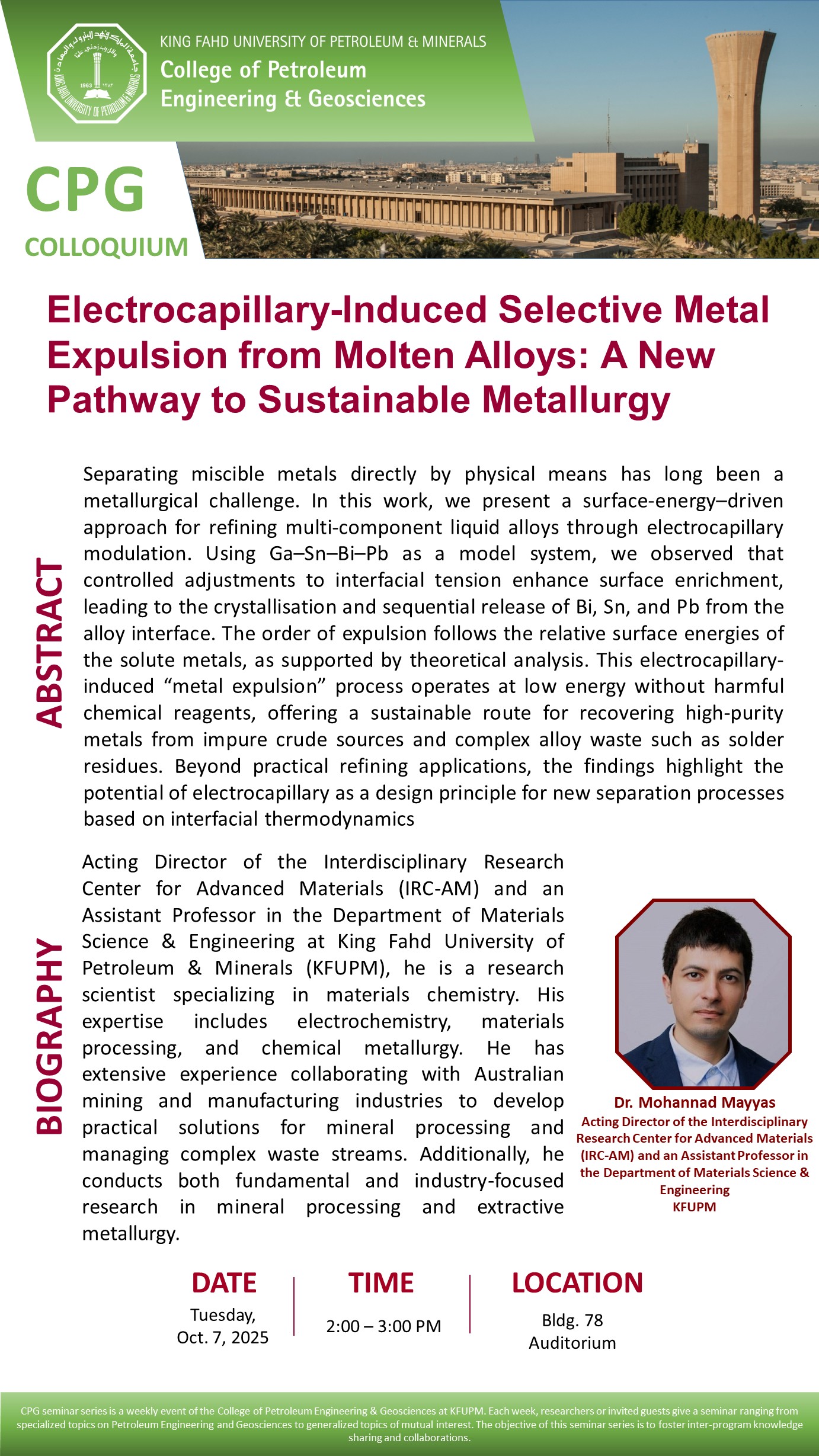 7oct2:00 pm- 3:00 pmCPG COLLOQUIUM𝐃𝐫. Mohannad Mayyas - Electrocapillary-Induced Selective Metal Expulsion from Molten Alloys: A New Pathway to Sustainable Metallurgy2:00 pm - 3:00 pm Building 78, Auditorium