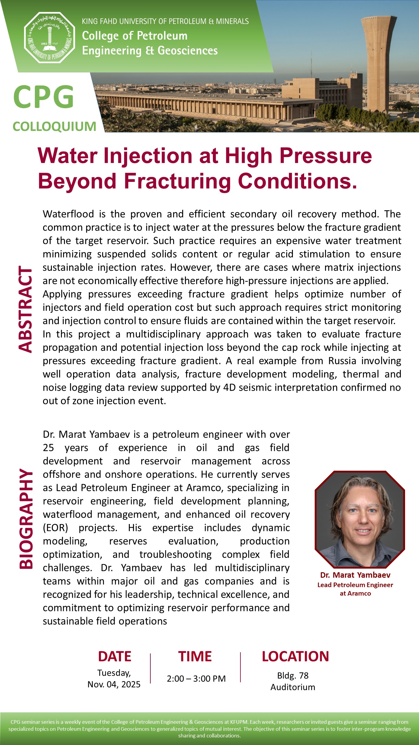 4nov2:00 pm- 3:00 pmCPG COLLOQUIUMDr. Marat Yambaev - Water Injection at High Pressure Beyond Fracturing Conditions2:00 pm - 3:00 pm Building 78, Auditorium