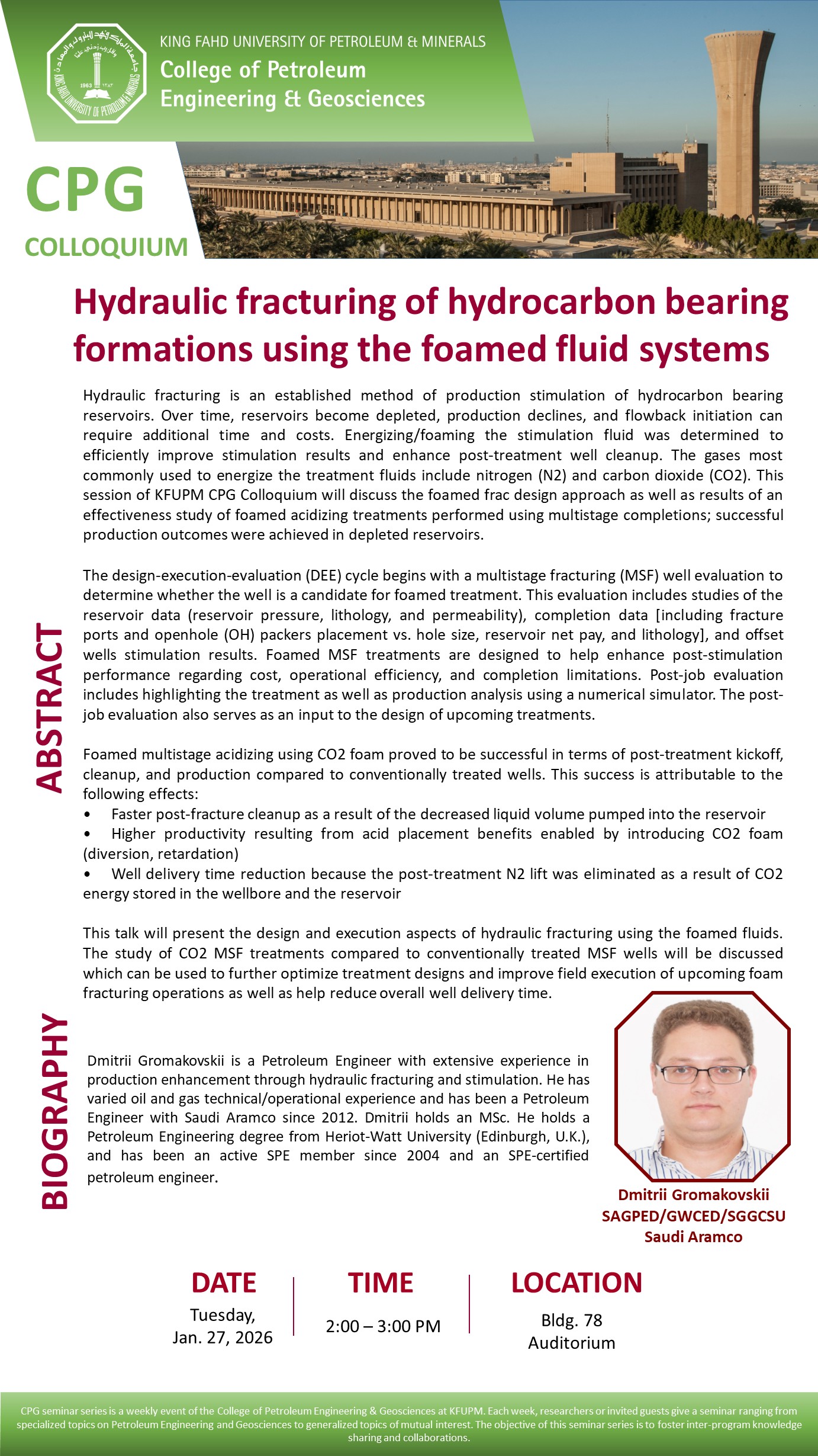 january, 2026 CPG COLLOQUIUM 27jan2:00 pm- 3:00 pmCPG COLLOQUIUMDmitrii Gromakovskii - Hydraulic fracturing of hydrocarbon bearing formations using the foamed fluid systems2:00 pm - 3:00 pm Building 78, Auditorium Time(Tuesday) 2:00 pm - 3:00 pm LocationBuilding 78, Auditorium Organizer CPG Learn More CalendarGoogleCal