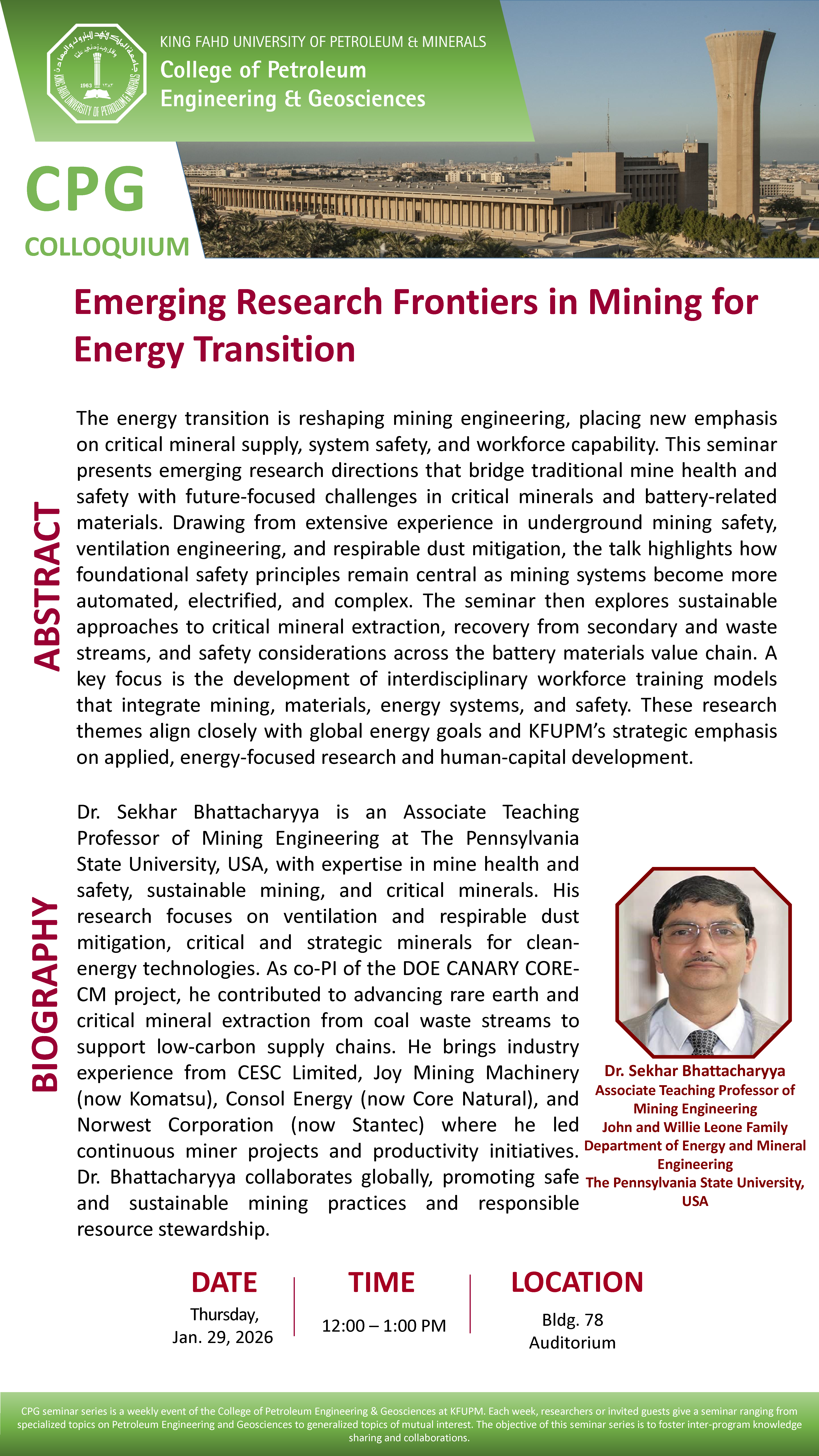 january, 2026 CPG COLLOQUIUM 29jan12:00 pm- 1:00 pmCPG COLLOQUIUMDr. Sekhar Bhattacharyya - Emerging Research Frontiers in Mining for Energy Transition12:00 pm - 1:00 pm Building 78, Auditorium Time(Thursday) 12:00 pm - 1:00 pm LocationBuilding 78, Auditorium Organizer CPG CalendarGoogleCal