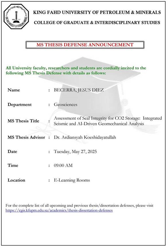 may, 2025 M.S. THESIS DEFENSE ANNOUNCEMENT 27may9:00 am- 10:00 amM.S. THESIS DEFENSE ANNOUNCEMENTBECERRA, JESUS DIEZ - Assessment of Seal Integrity for CO2 Storage: Integrated Seismic and AI-Driven Geomechanical Analysis9:00 am - 10:00 am Building 76, eLearning Room Event DetailsMS Thesis Advisor: Dr. Ardiansyah Koeshidayatullah Event Details MS Thesis Advisor: Dr. Ardiansyah Koeshidayatullah Time(Tuesday) 9:00 am - 10:00 am LocationBuilding 76, eLearning Room Organizer Department of Geosciences Learn More CalendarGoogleCal