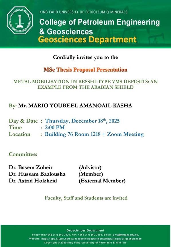 Committee: Dr. Basem Zoheir (Advisor) Dr. Hussam Baalousha (Member) Dr. Astrid Holzheid (External Member) Join Zoom Meeting https://kfupm.zoom.us/j/93154952546?pwd=ozKoBwtndsaBWcWqYlugRbL52RhgiX.1 Meeting ID: 931 5495 2546 Passcode: 453925